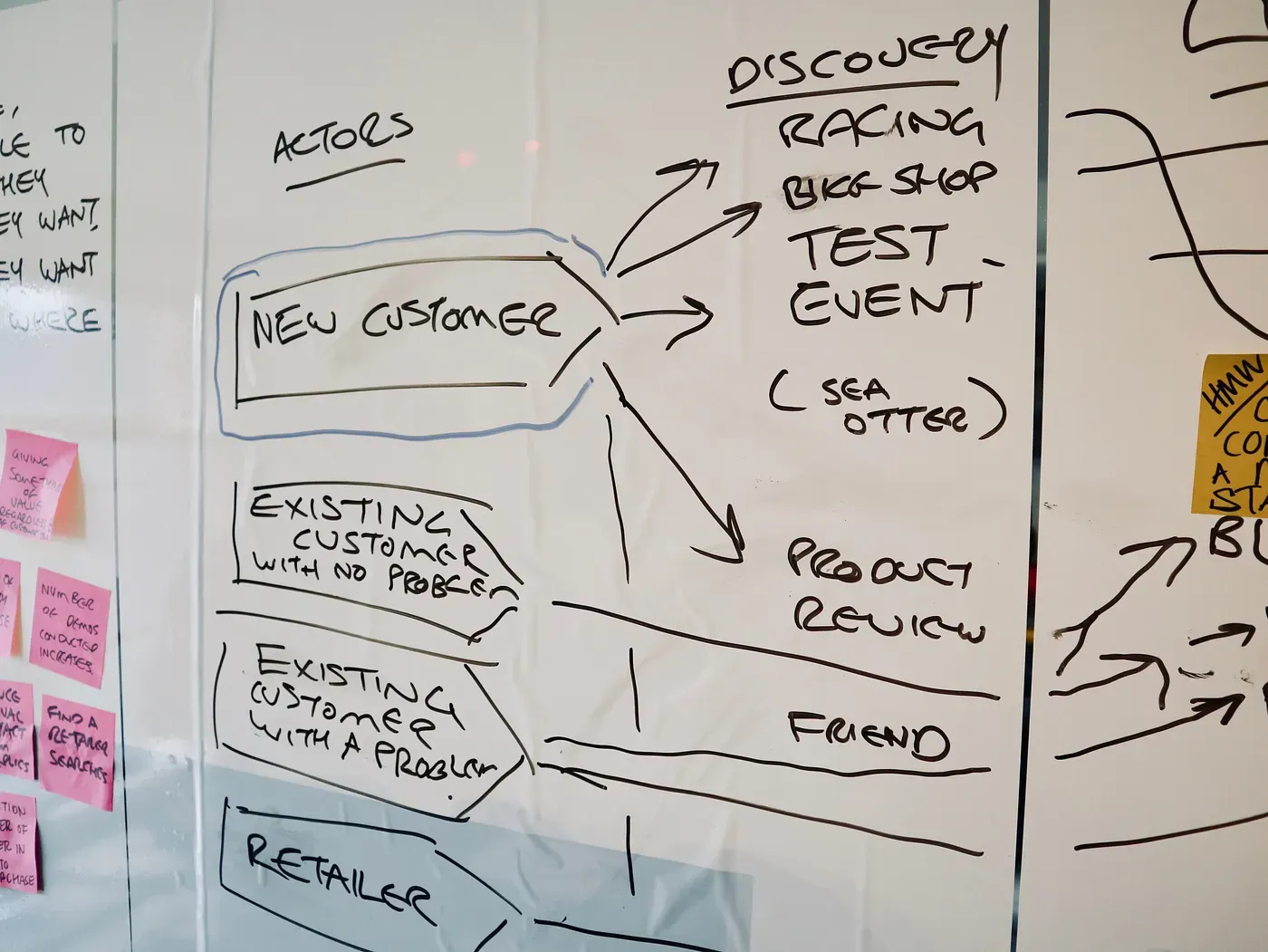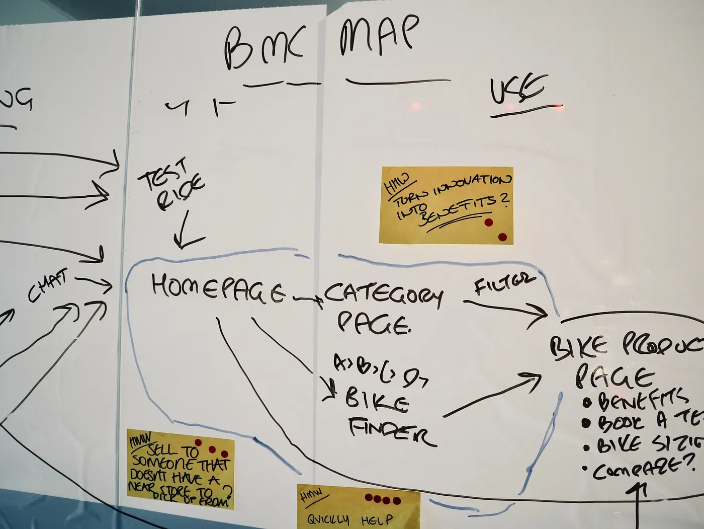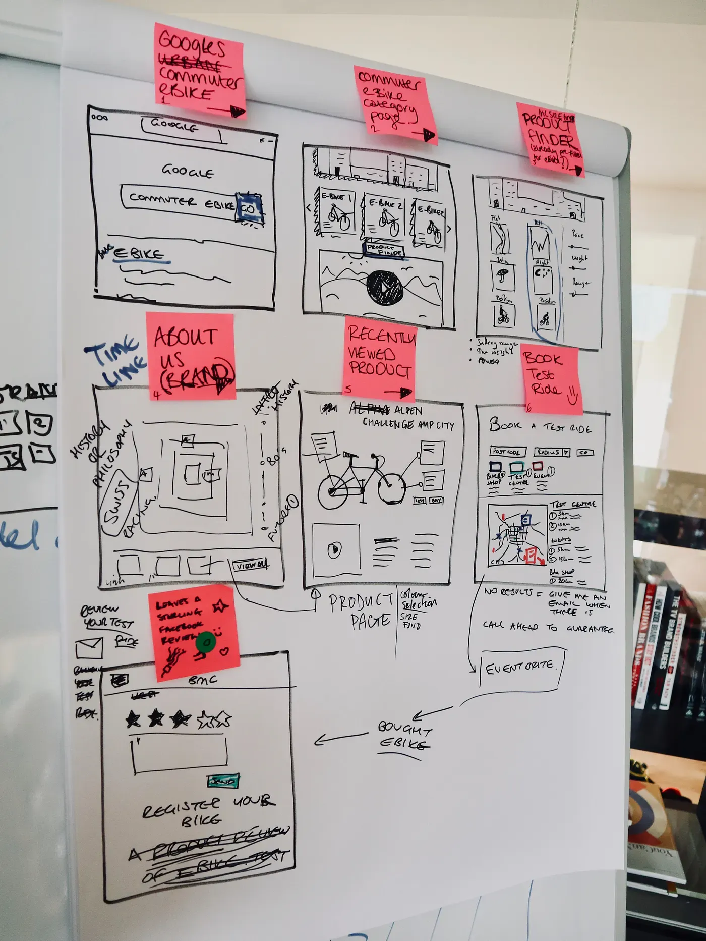 The user flow David (our decider) selected was originally for E-bikes, but after thinking some more on what we want to achieve and how the rest of BMC Switzerland will use the learnings, he decided to replace ‘E-bike’ with ‘Road bike. The journey that we will prototype is for a new customer looking at road bikes.